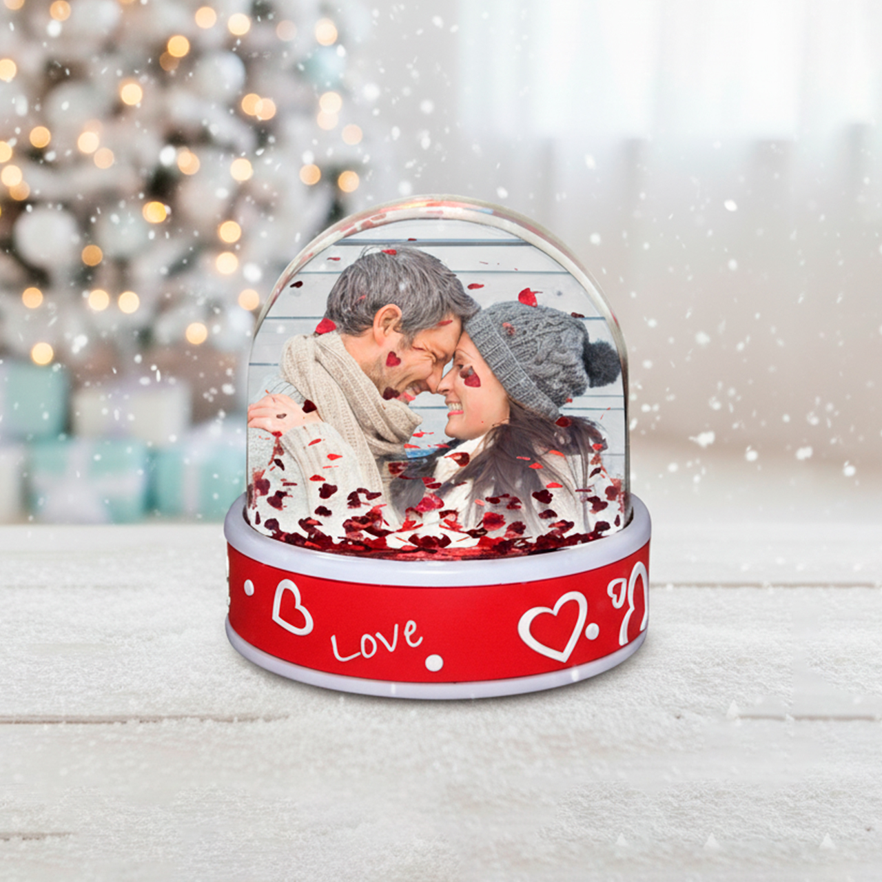Esta bola de nieve fotográfica está hecha de plástico transparente de alta calidad, contiene un líquido transparente en el que giran los destellos rojos del corazón. La base tiene una decoración roja con ‘amor’.