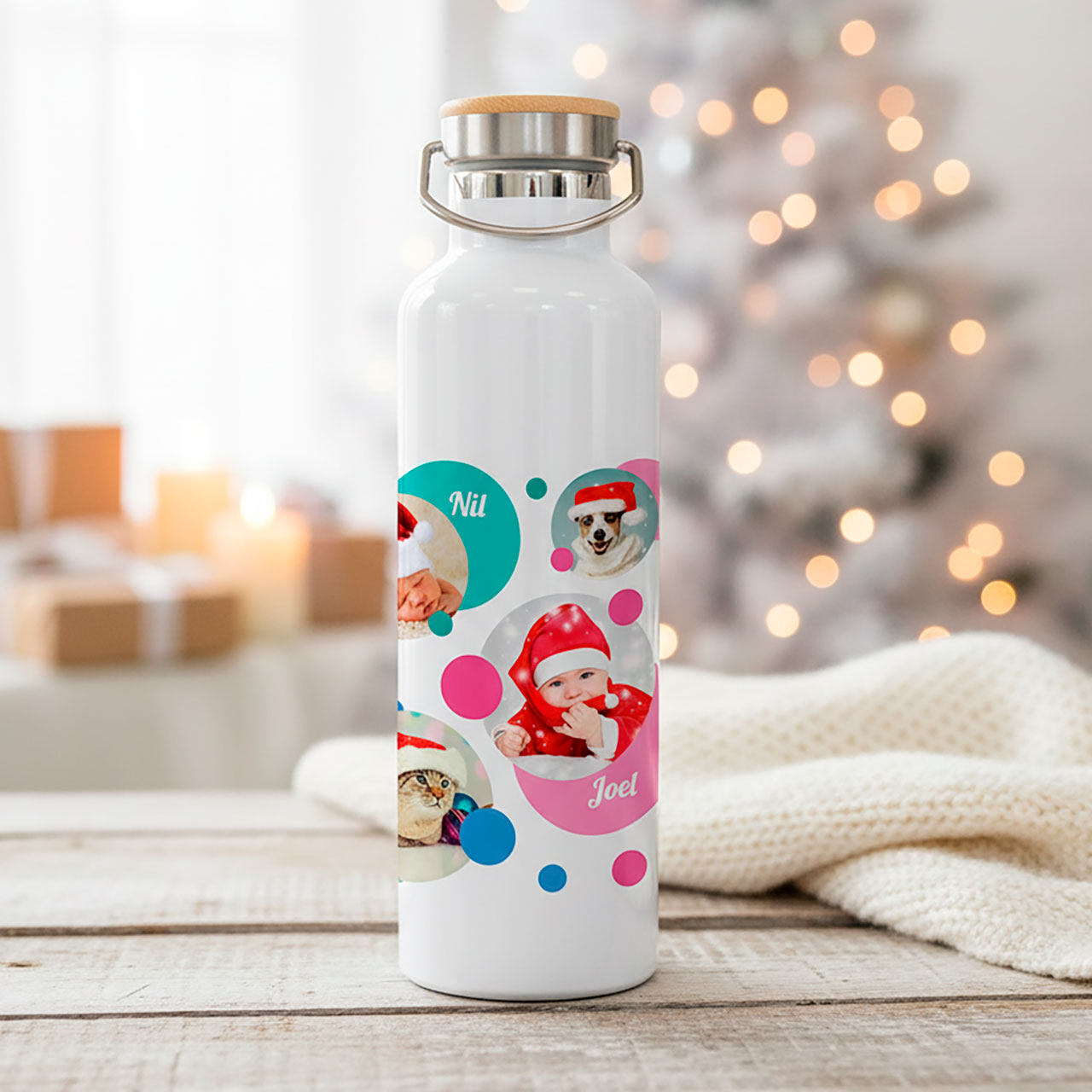 Botella portátil de acero inoxidable con asa para que puedas transportarla cómodamente, llevarla en tu bolsa o mochila. Personalízala a tu gusto, con tus fotos, logos o dibujos.